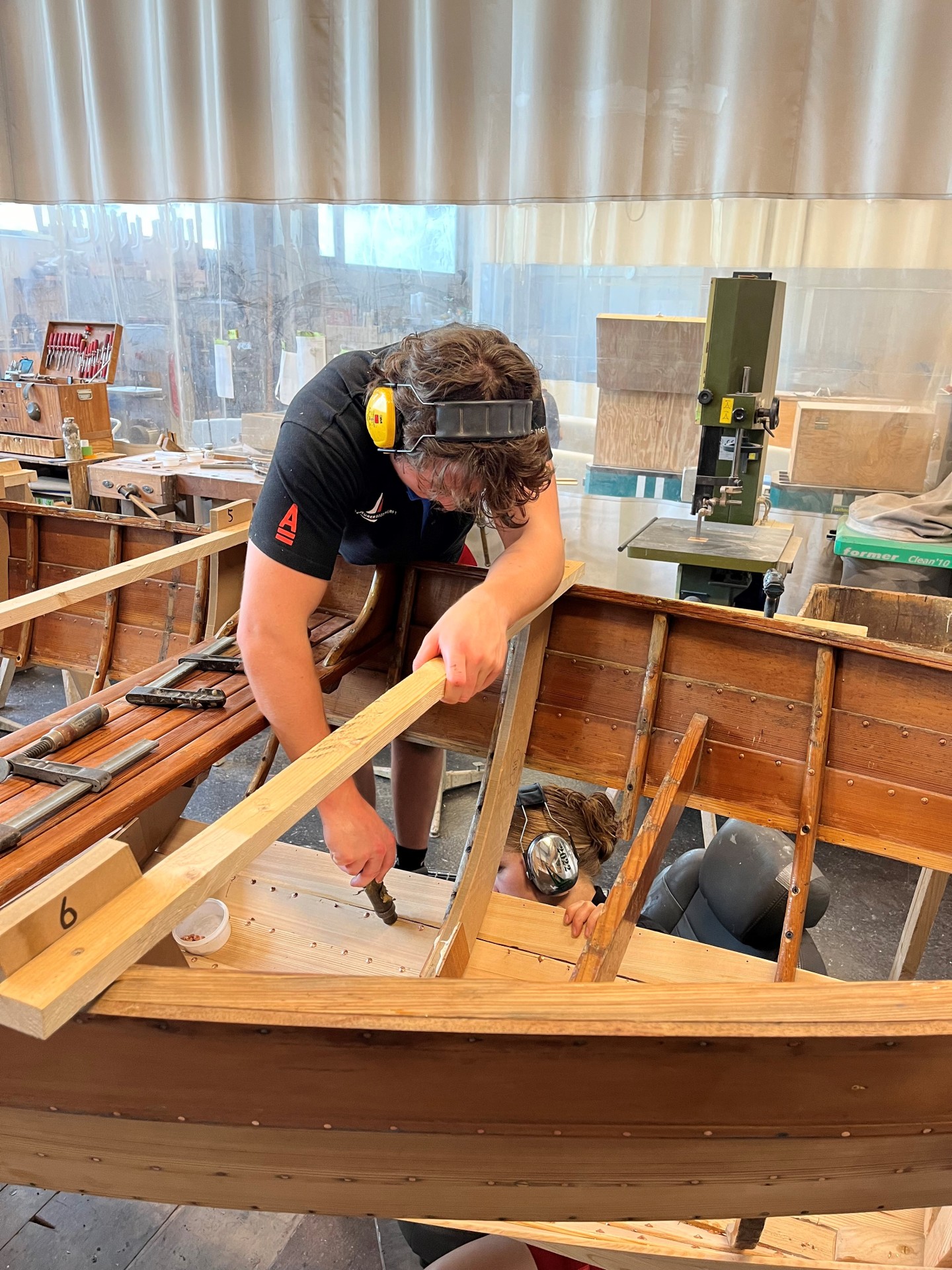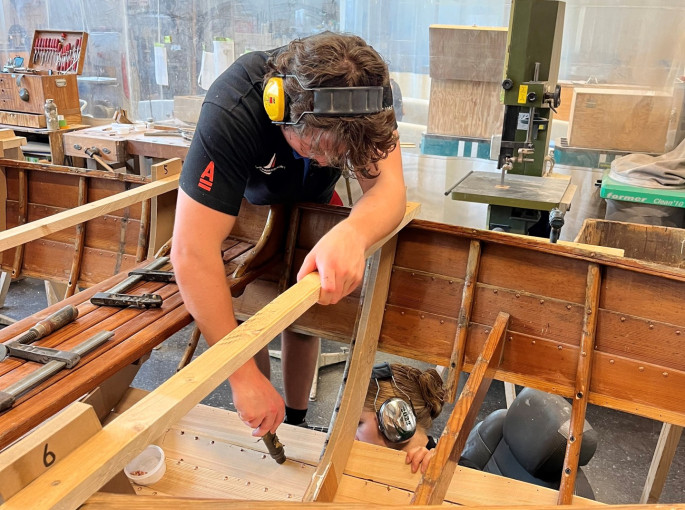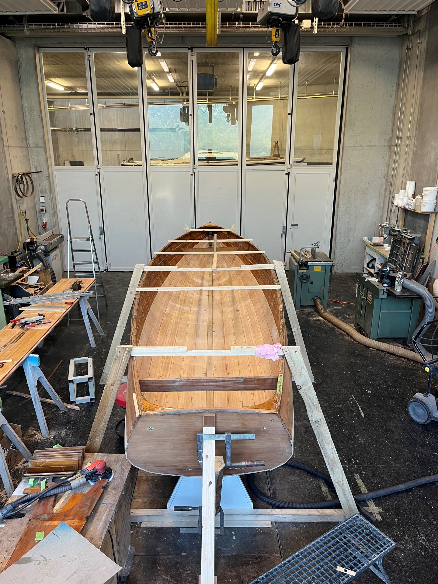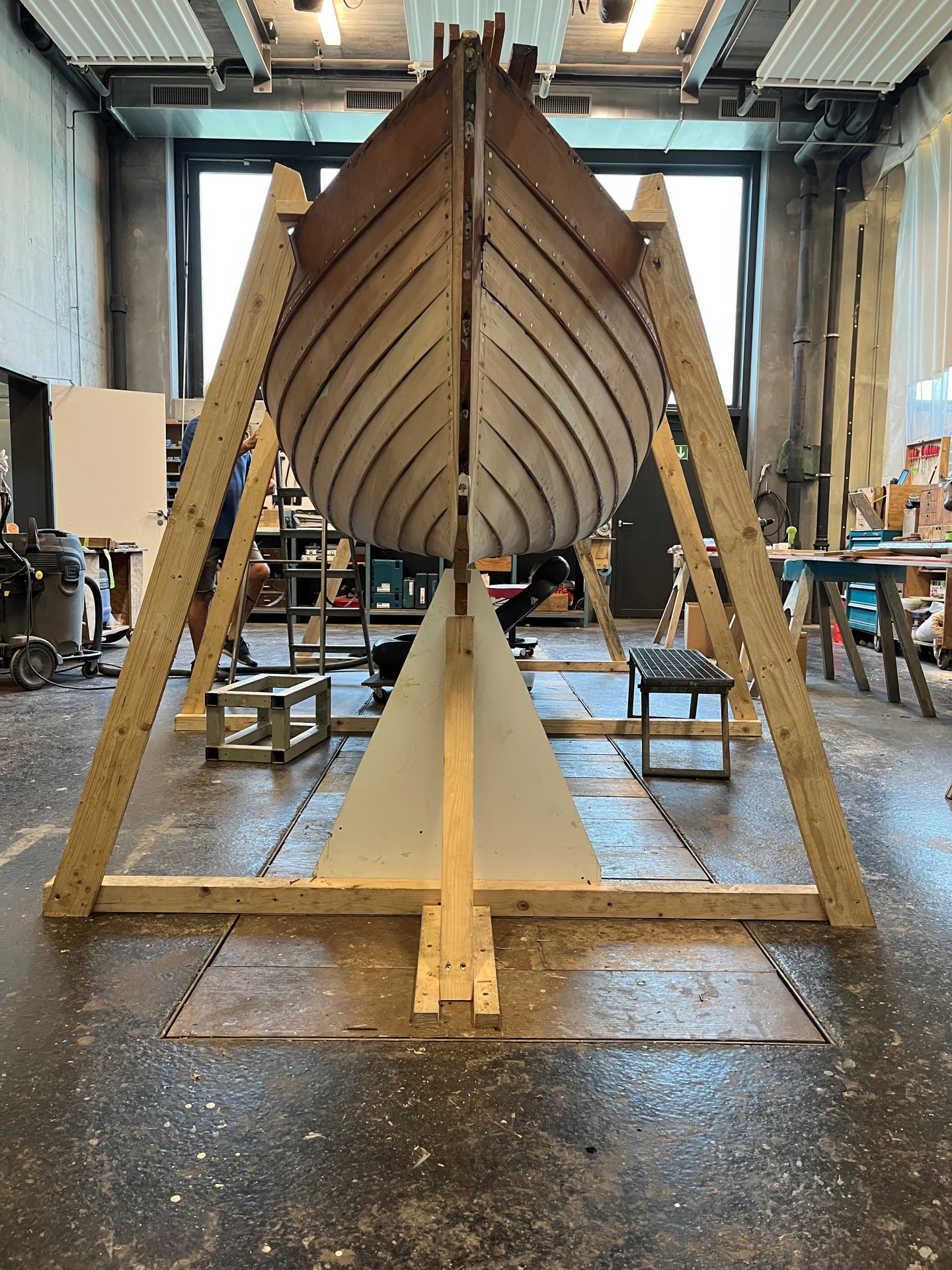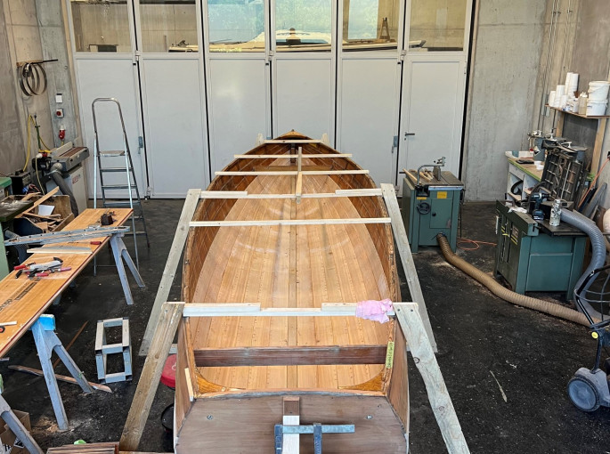 Nach kurzer Sommerpause wurde nun der Rumpf wurde fertig beplankt und vernietet. Nun werden die Bodenwrangen ersetzt und die Spanten eingedämpft.